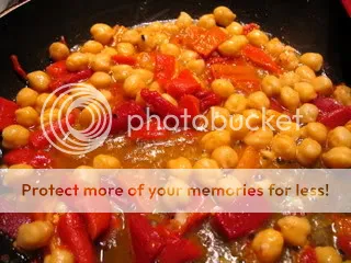 Four brownie points. I watched Iron Chef America: Battle Chickpea a couple of days after making this dish and wondered, where in the hell did they get fresh chickpeas? So true as it is that canned and jarred foods aren’t as nutritious for you as fresh versions, the ingredients in this quick and convenience store-friendly dish are still virtuous. Chickpeas are a great source of protein low in calories, and roasted red peppers still hold their weight in vitamins C and A, as their color might suggest — albeit fresh ones would be much better for you. I barely used any salt in this recipe because one thing cans and jars do have a monstrous capacity to increase is an item’s sodium content.