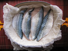 Now to cooking them. You’re off to a headstart by getting fillets, which given their size need only a couple minutes on each side. You can give them a quick seasoning of salt and pepper and run with that. But if you’re shy of encountering the full force of the fish’s fishiness, go with a marinade with flavors you like. I tried a miso marinade, adapted from a recipe in Washoku: Recipes from the Japanese Home Kitchen. It’s pretty basic — white miso paste, rice vinegar, optional yuzu (a Japanese citrus similar to lemon), and time. I skipped the yuzu and smeared together the rest. The only fussy part is keeping the miso paste from direct contact with the flesh of the fish, because it’s grainy and can be undesirable in texture if lodged in. So we just keep it separated with a double-layer of cheesecloth.