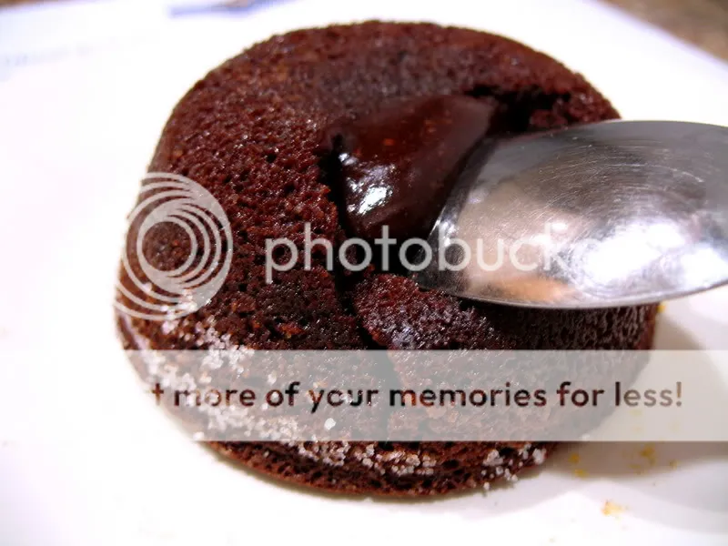 I got the recipe for individual soft-center chocolate cakes, at my boss’s suggestion, from the Ghiradelli website. She told me that she makes these things for her in-laws after dinner because they’re so easy, and need only ten minutes to bake. The outcome is blissfully professional, enough to win over the hearts of any in-laws or casual acquaintance alike.