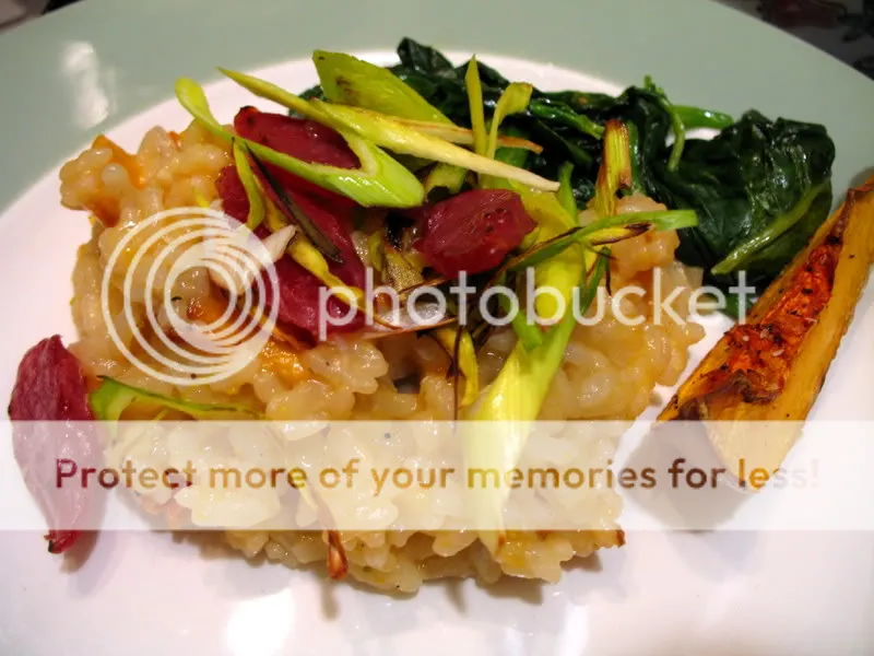 Roasted Butternut Squash Risotto with Wilted Spinach, Leeks and Chinese Sausage