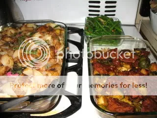 seitan had never been so tasty as Becca’s homemade, home-kneaded version at right, baked with brussel sprouts; left, Matt’s tangy potato salad with red onions, capers and “I accidentally put in cilantro instead of parsley”