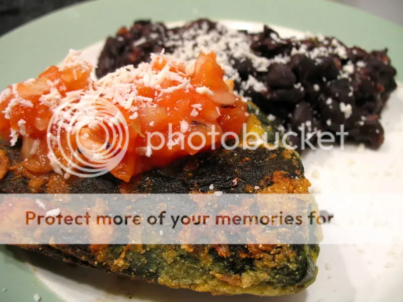 Heat enough oil to coat the bottom of a pan. Lightly dredge the peppers in the cornmeal or flour first, then the egg, then the cornmeal/flour again. Fry for a few minutes on each side until nicely browned. Top with salsa and cojita cheese. Optional: serve with a side of cooked black beans (I sauteed 1 can with liquid, a splash of water and dash of spices for 5-10 minutes).