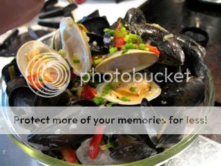 afraid that I didn’t have enough mussels on hand, I went and got some littleneck clams, too. This turned out to be unecessary, but not untasty. (note: these needed to be put into the steamer a few minutes before the mussels, as they take longer to open.)