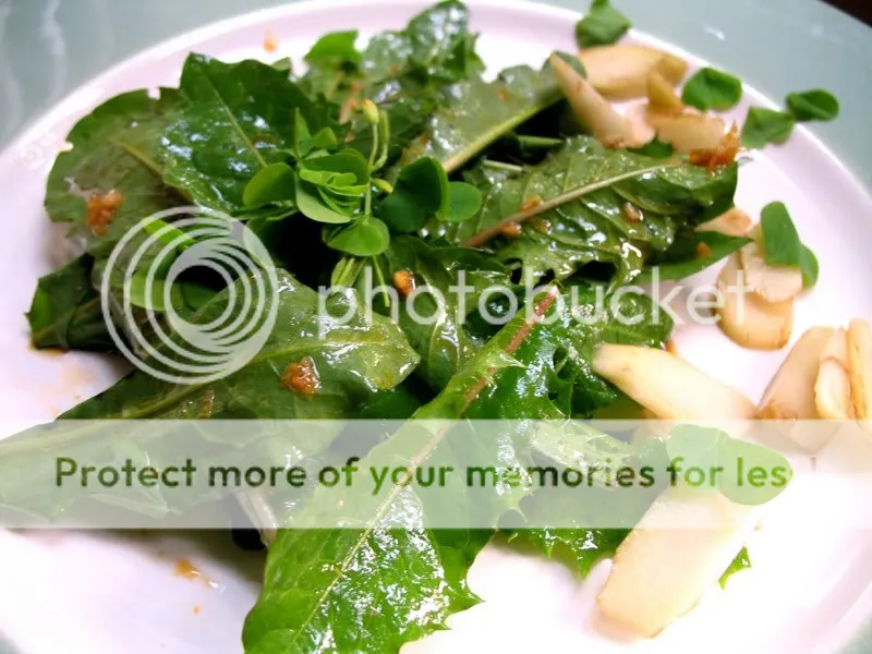 dandelion greens, wood sorrel and second-year burdock stem in a soy vinaigrette made with wild garlic and hedge mustard, all foraged from Prospect Park (except liquids)