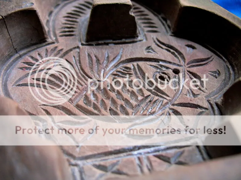 The cookie/cake type dessert with the mysterious triangular shaped hole that this tool would form could not be any deeper than about 3/4 inch. That leaves out moon cakes, the traditional Mid Autumn Festival dessert that are also molded in a decorative cast and have a sweet filling inside a cakey shell. Or does it? Is there some shallower version of the cake made in certain regions of China, perhaps not served solely on the holiday? How is the handle necessary? And what about the cluster of identical little ring-shaped indentations on the back of the mold? A sign it was used industrially in some commercial kitchen with lots of machines? A sign it was used by aliens?