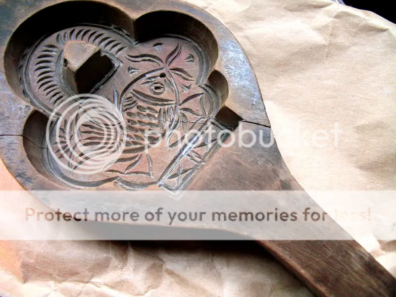 I picked up this gadget last week when I was walking along Smith Street in Boerum Hill and wandered into a cute vintage and craft knick-knack store called Enamoo. In a small box, there were three of these wooden cookie molds, each one nearly completely different in shape and design except for its long, stemlike handle. Mine was the largest one of them. It has a crack down the middle and a carved fish design symbolizing good luck. The lady at the store knew that these were antique cookie molds, though how antique, I have no idea. She told me that her partner had collected them on an antiquing trip.