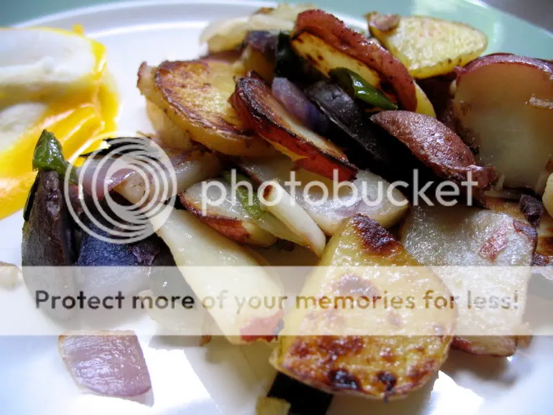 Four brownie points: Hash browns were one of my first favorite foods, but the way it’s commonly prepared is none too healthy — swimming in butter and often some processed corned beef. The almost-boiled treatment of the potatoes in my version keeps the potatoes more crisp than soggy, and the sparing use of butter lets them absorb flavor rather than simply grease. The freshness of ingredients here is also key — with each bright green pepper and additional veggie, the nutritional content goes up accordingly.