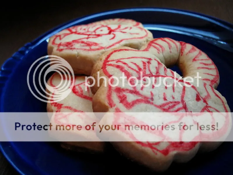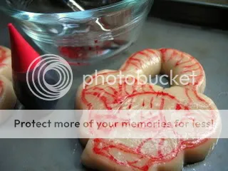 The main problem was the fact that no dough known to man (or within my amateur baking knowledge) would come cleanly out of the carved, wooden mold. No amount of flour dusting or greasing would do the trick, no amount of banging, whamming and poking. I eventually had to place a sheet of plastic wrap between the mold and the dough; done this way, however, the mold impressed only the faintest whisper of the carved design into the dough when raw. When baked, it was vanished. So while the dough was raw, I reinforced the design by tracing it in food coloring with a watercolor brush. Red, to coincide with the Chinese good luck theme.