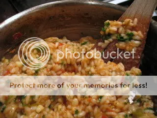 Heat oil in a heavy-bottomed pan. Add onions and chile peppers and “sweat” on medium-low heat until onions are translucent, about 6 minutes. Add the rice and stir to coat evenly with oil and toast the grains, about 4 minutes. Add wine and stir until mostly dissolved. Add tomato and a ladleful of the warmed stock and stir frequently until most liquid is dissolved.