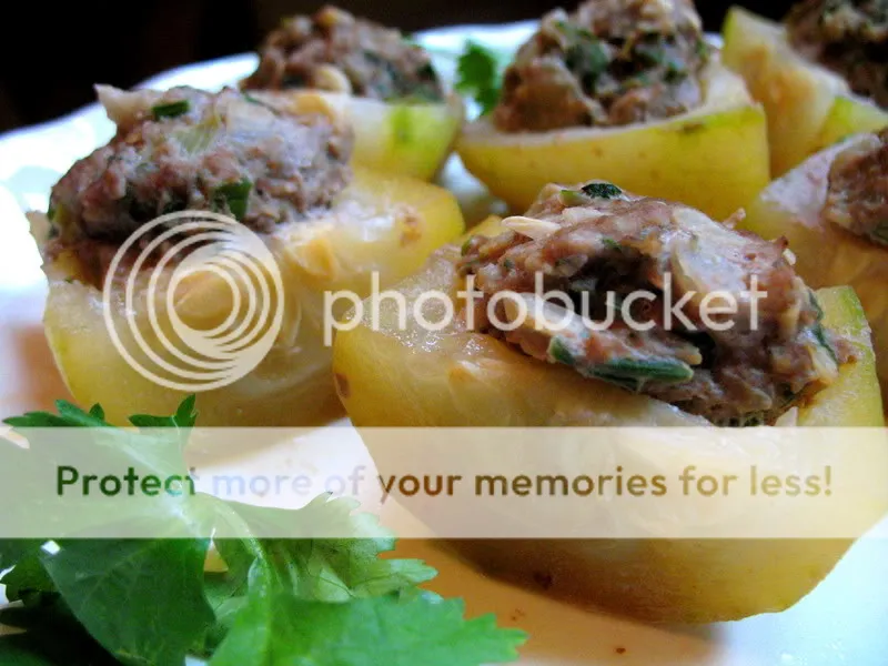 a fuzz-free steamed fuzzy melon stuffed with turkey appetizer — works well with zucchini, too