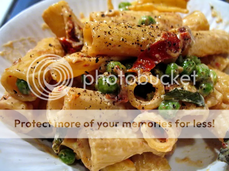Except for this recipe! The pasta in the photo above (sorry for not providing it at first, Andy!) was something I had tossed together one evening when I had literally no fresh vegetables in my home. Not a one. I did, however, possess half a frozen package of peas, some sundried tomatoes, cream and garlic, and with those and rigatoni, a very un-Bittmanesque pasta was born.