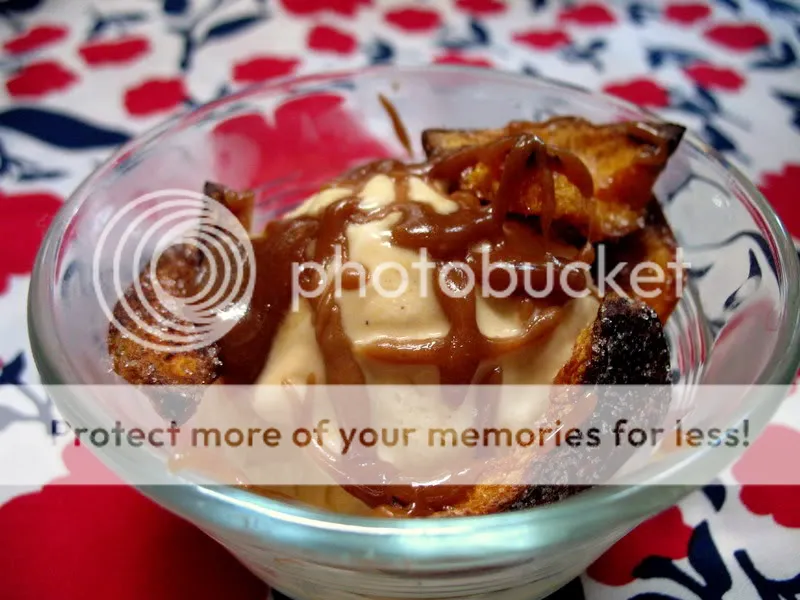 To top it all off, I made myself one mean sundae, with roasted slices of butternut squash that were cooled and then tossed in sugar, and a quick hot caramel sauce that turned into toffee moments after being a liquid. How to make the caramel? Simple: heat up a tablespoon of butter in a heavy-bottomed skillet, on medium heat, with two tablespoons of sugar, and stir frequently a few minutes. The sugar will visibly melt and congeal with the butter to a caramel-brown state. Drizzle like crazy wherever you please. Then be sure to let your pan cool before you scrape off the candied bits.