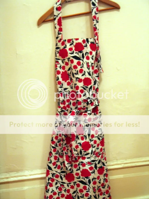 The apron actually began as several yards of rescued fabric that I found so becoming, I snatched it one day without a clue of what I might do with it. I found it in the sample room of the retail company where I work, and after a company-wide sample sale, it was about to get tossed. It appeared to have fallen out of its original package, but I believe that this sturdy-weft, printed cotton fabric was manufactured to be the part of a shower curtain that hangs outside the tub, as a decorative addition to the plastic curtain. I liked its bold-but-sweet floral pattern so much, I even used it as the background for this shot of my rum butternut squash ice cream.