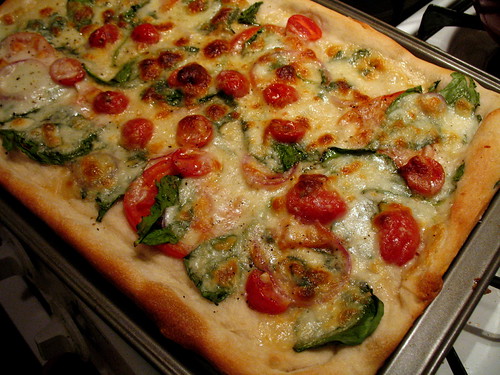 Pizza. I had a little bumpy start with homemade pizza in the past. I still don’t own a proper pizza pan, stone, or crisper. But now that I’ve decided to leave the crustwork mostly in the hands of the guys at the closest pie shop — who sell about 4 individual pies’ worth of dough for $3 — I’ve opened up whole new channels of pizza-making that were previously dammed. Unlike today’s most astute pizza scholars, I don’t worry too much about the dough; I pile on the tomatoes, spinach, artichokes, mushrooms, leftover cilantro, heaven knows what else, butternut squash on occasion. It’s still pizza — who cares?