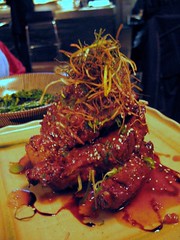 a towering stack of sake-marinated ribs topped with fried chives had just the right amount of heat
