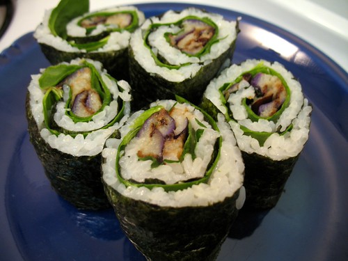 To my surprise, making these rolls at home was much easier than it looked. In fifteen minutes’ time (after the rice was cooked), I had a gorgeous, healthy and tasty meal that more than satisfied my cravings for cheap Japanese take-out. It was just fresher. And more interesting, with the slightly chewy seaweed playing off nicely against the crisp spinach, and a touch of soy sauce to accent the mild savoriness of the still-warm eggplant cradled inside. This recipe’s shown me that as long as you have all the right ingredients, experience might not be that important.