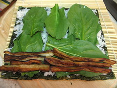 It’s not a very clever recipe after that in terms of Obama-ness. According to WikiAnswers, Obama’s favorite food is Chicago pizza, so I guess I’m way off the mark here. The man could hate sushi for all I know. But at least eggplant and spinach are Italian cuisine-friendly components. In all honesty, I’ve been itching to make sushi and maki for a while. In the last couple of months, I purchased a book, a rolling mat, sushi rice, sushi vinegar and nori, but haven’t had the time to put it all together. I took things step by step, spending one week to read up on the finer points of mixing the rice, and so on. I think this slow, measured progress is sort of Obama-like in his state victories. And to parallel his critics’ concerns, I happen to be very inexperienced at maki-making.