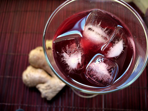 I’d originally wanted to add a twist of lime, hence the word “Rickey” (as in Lime Rickey) in the cocktail’s name, but I realized that it would be too sour a partner for pomegranate. I’d also planned on mixing this up with the more traditional gin. But seeing as there were a few new flavors just mingling and making nice with one another for the first time, I didn’t want to crowd the classroom. So I went with the neutral vodka. Finally, I added a few slices of muddled fresh ginger to the recipe for that beloved spicy contingent. Herbally speaking, the fresh roots have long been known to help improve blood circulation (one of the reasons I drink ginger tea in the winter, lest my pinkies turn white) as well as help prevent gas, nausea, menstrual cramps and inflammation of the blood vessels, which can lead to migraines. The perfect counter for a jalapeno-rich diet?