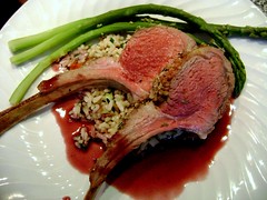 Rosemary Crusted Rack of Lamb with Wild Rice Ragout, Asparagus and Red Wine Reduction