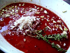 I really wanted to make a pomegranate reduction, but when my plans were foiled (fresh pomegranates out of season? No way!), I settled for a straightforward red wine reduction.
