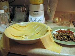 A series of unfortunate events occurred during the making of this unlikely dinner special (which is only natural, since I was preparing it for a room full of hungry people instead of just myself). First, the half-and-half in my refrigerator had soured to a disgusting goop — thank goodness for late-night bodegas. Then, the pasta-like noodle sheets I’d planned on using were likewise rotten and bluish. So much for checking inventory beforehand. I’m actually glad that the latter error forced me to turn to the only other option in sight — mixing, kneading and hand-cranking out fresh lasagna sheets from a couple of eggs and a cup of flour. (I’ve said it before and have to say, once again, that cooking at home can be a good way to get a workout.) Once this fresh pasta was baked into the egg casserole and served up in squares, it had absorbed the dish’s flavors and grown to chubby, flaccid layers soft enough to cut through like cake.