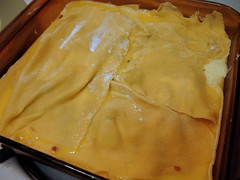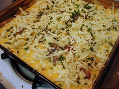 What do breakfast, lasagna, free pool tables and cheap pints of beer have to do with one another? Nothing. Except that they’re sloshing around inside of me as I write this (the free pool more figuratively, say an X-ray glimpse into my stomach with sound effects) a few short hours and not enough sleep after indulging in all. I trust that you could skip the last two items in that equation and have yourself a mighty fine meal out of breakfast lasagna, however. And unlike my last recipe, this one should give you plenty of time to plan ahead for a savory weekend brunch. Or is it dinner?