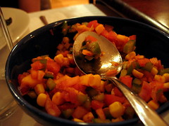 corn and mango salsa was stationed along the table beside bowls of tortilla chips