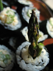 For asparagus rolls: depending on how thick your asparagus are, arrange a few stalks about a half-inch away from one end of the nori sheet, on top of the rice.