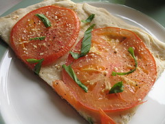 That looks really delicious, too. I have to say about beefsteak tomatoes, I was watching this show that was thinly veiling how they were mocking Jessica Simpson et al, and said “That girl is only famous for how stupid she is. Someone offered her a beefsteak tomato, and she declined because she’s a vegetarian.” I couldn’t stop laughing. Awesome line.