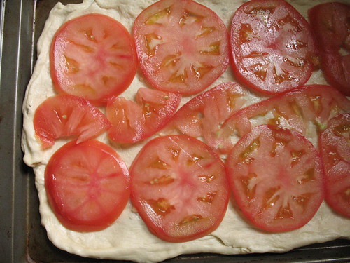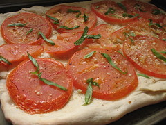 Food this fresh and flavorful needs little, if any, real cooking. I came across a pile of “beefsteak” tomatoes at a packed stand in the Greenmarket and decided on this principle on the spot. With a name like that, who needs actual meat? I can’t figure out how the term was coined, but I’ll bet it was invented by hardcore vegetarians on a streak of natural endorphins. The thick slices cook to a sauce-like consistency in a hot oven for fifteen minutes, placed atop raw pizza bread dough. I smeared the dough first with a crushed garlic and salt mixture to give it some pungency and topped the tomato slices with salt, pepper and a dash of grated Parmesan. It smelled like a pizza parlor while it cooked. Out of the oven, and after cooling for a bit, some freshly sliced basil went on top. Who needs marinara?