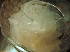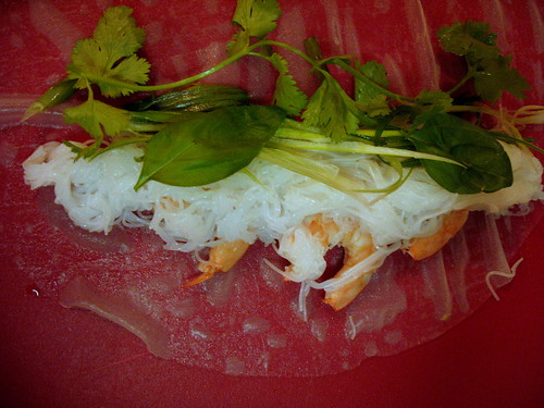 One of the most intriguing things about this dish for me is its transparency. Besides Jell-O salads of the fifties, I can’t think of too many other (or very good) foods that are meant to showcase its ingredients through an edible veil. And for good reason, too — you can just see how crisp and fresh-tasting those basil leaves or the fleshy poached shrimp are going to be from looking at the showy little bundles. This must be why people created this arduous use of such fine rice sheaths instead of just using it for tracing paper and stopping there.