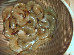 Heat a pan of water deep enough to submerge the shrimp and the rice noodles. Once it’s boiling, drop in the shrimp. Cook for about 1 minute (or 2-3 if they’re larger). Remove with a slotted spoon and place into ice water to stop the cooking. Peel and de-vein the shrimp (a tedious process, but it’s made easier if you dunk the shrimp under water after splitting the backs and removing the “vein” with the point of the same knife). Set shrimp aside and reserve boiling water.