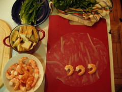 Two maple leaves: Yeah, so we’re not in Vietnam. So… the imported dried rice foods that I bought in Chinatown were chugged across the sea. I imagine there probably are some outfits that manufacture these ingredients in the States, but I didn’t find them, and sure as heck don’t know how to make them. Then, because I was already in Chinatown, and to make my shopping more streamlined, I simply bought the rest of the ingredients there, instead of looking for the scallions and cilantro at the Greenmarket (the basil I already had), and succumbed to their cheap seafood as well. Seriously, $4.99/lb for fresh shrimp (albeit farmed in Thailand or China and shipped across the sea)? It’s a steal. And yet this dilemma is why I hardly ever make shrimp on this blog (or otherwise).