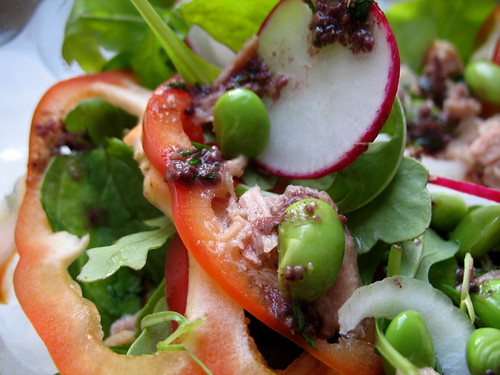 So the final retribution of the story, you see, is Salade Me-coise. Not by-the-book, proper salade nicoise (not that I tend to cook anything by the book), but a confluence of some of its typical ingredients, leftovers, and other things I sort of hold dear. Frozen edamame? I can’t live without them. As I no longer had green beans as I did for the previous day’s version, into the salad these steamed and husked beans went. Radishes and onions were plentiful in my refrigerator, so I gave them a good slice, too. And in place of the olives I’d all but gobbled up, I found an old but still-good container of olive tapenade in my fridge (a relic from a get-together), thinned it out with some vinegar and added fresh chopped herbs for a pungent, chunky dressing.