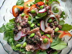 Four brownie points: Whenever you’re dealing with olives, you’re in Sodium City. But with this salad, instead of getting one big bite of it at a time and with other bites zip, you have an even distribution of salt, which led me to not add any extra salt anywhere else in the recipe. I figure I used less total olives than the previous version, hence less salt. Edamame is a great source of protein, fiber and many other nutrients for few calories and sodium; oil-packed tuna, however, is much fattier and saltier though it yields valuable omega-3 and omega-6 fatty acids to help combat heart disease (mercury content notwithstanding).
