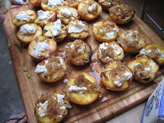 grilled peaches with ground coriander and lemon zest-spiced chevre and caramelized shallots