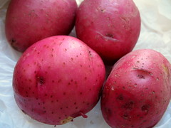 the farmers’ stand selling these red potatoes had a sign that read: “just dug”