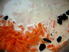 Combine the milk, cream, carrots and raisins in a medium saucepan. Bring mixture just to a boil, then reduce heat to very low. Let simmer, stirring occasionally, for 25 minutes. (Do not let boil.)