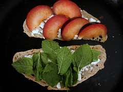 Heat a sautee or frying pan over a high flame. On another burner, heat a heavy, preferably cast-iron pot or pan that will fit on top of the other pan with a sandwich in between, also on high. Place the bread on the first pan, and arrange the feta evenly on both pieces. Arrange the plum slices on top of one piece, topped with the mint and optional black pepper. Let cook 2-3 minutes, until the feta looks like it’s starting to melt a little. Reduce heat if you smell any burning, or turn it off completely.