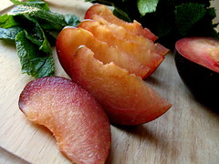 Three brownie points: Attack those black plums! Deep color betrays deeply nurturing antioxidants, surpassed only by blueberries and cranberries (attack them, too, when in season). Apparently plums also promote better iron absorption and help prevent macular degeneration, too. They’re also high in Vitamin C, improve digestion and may help prevent cancer and heart disease. Repeat: attack! Plummet! Okay, you get the point already. Use an abundance of fresh mint for the most leafy greens nutrition (and cooling sensation). And I like the fact that low-fat feta seems to be commonly produced these days. My pack of crumbles says they have less than 5 grams of fat for a 1/4 cup.