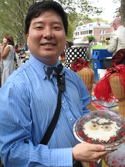 After the tasting session, and some laying around on the grass, the judges stepped onto the stage. They announced the winner of the “Hobo’s Choice” award first; the idea behind this clever title was that the winning pie looked so appealing that a hobo would steal it if it were sitting on a windowsill to cool. I wasn’t surprised when the award went to a blueberry, cream cheese and fig pie, with fresh fig slices arranged in a fan on top. Next, the judges announced “Mom’s Best.” There were a lot of pies that looked like they were the best efforts by Mom on the table, including a creatively adorned apple pie — just the kind Karol had won with last time. But the champion was not to be upset. The award went to the pumpkin-cheese checkerboard “dream” pie! Just as soon as Karol had returned from the stage, they announced the “Most Original” award… and it was my turn to step up. I guess the judges were as pleased with the way my pie turned out as I was. And finally, they announced a new category. Since there were a handful of savory pies on the table this time (unlike last time, when my asparagus pie was the only one), they handed out an award to the tomato tart for best savory pie. For some reason (which I forgot to ask about), we all won a copy of a jazz history book called Delta Blues. A little inspiration for the next Jazz Age-themed pie contest baking session, I suppose.