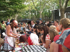 So off to Governor’s Islands we went on Saturday, with our pies and picnic baskets in tow. There were slightly more pies in competition this time, around sixteen or so. Many of them looked astounding, too. We watched as the panel of five judges (four adults and one child, as it were) dug into a slice of each amidst a bustling, hungry-eyed and impeccably dressed crowd of lawn party-ers. The pie contest had become a major spectacle of the event. Nearly everyone on the island was crowded around the pie table, anxious to get their hands on a slice of their request. So, too, was I — after all, I hadn’t gotten to cut into my own pie.