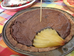 When the judges had finished their tasting, the pies were sliced up for first-come, first-serve sampling by the crowd. Luckily I was poised in the right place at the right time, and picked up a slice each of Karol’s and my pies. If I dare say so myself, these were both polished off pretty quickly. Karol’s pumpkin-cheese checkerboard pie filling was velvety-smooth and every bit as rich and satisfying as a pumpkin pie or cheesecake should be. Only it was combined; and the forces were now indestructibly scrumptious. My watermelon pie was, to my relief, a consistent creamy gelatin texture throughout, and it wasn’t too firm, either. It was just the way I had wanted it to be. I had gone back and forth about decorating the top of the pie with dark chocolate chips, as if watermelon seeds. I finally decided to just go for it — I was aiming for “Most Original” anyway — and I was glad that I did. I think they added a little something special.