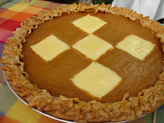 My fellow pie baking contestant Karol also had a dream pie. Her apple pie had won the “Mom’s Best” award at the last pie contest, and this time she wanted to make a pie with a checkerboard arrangement of luscious pumpkin and cheese fillings. I don’t have a very clear idea of how she ultimately did it, but she did, after two tests. (I may finagle the recipe out of her in a post to come!)