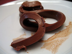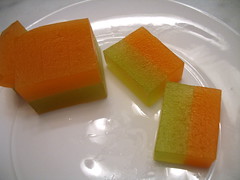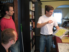 Last Thursday I indoctrinated myself to this fabulous world of fantastical cooking by attending a six-hour food science class in the home of Alex Talbot and Aki Kamozawa of Ideas in Food. Along with me for the ride were cooking pals Mark, Michael, Daniel and Andrew. Our particular class was centered around the hydrocolloids pectin and methocellulose. These gelling agents provide various ways of binding foods together, making them pliable, or otherwise changing their textures. The one we began with might sound familiar, pectin. Often used to jam and jelly mashed-up fruits, pectin is a naturally derived substance that we added to chocolate to create Alex and Aki’s recipe for “Sliced Chocolate.” We also stuck together a stack of melons with it, bound sliced zucchini into a thin sheet of attached snowflake-like circles, and made “lentils” out of droplets of hoisin sauce. Pectin: nature’s “Fruit Glue,” as Alex and Aki coin a technique of theirs.