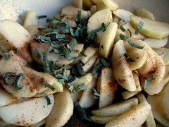 Six maple leaves: Great luck that this cook-off was on a Sunday, which meant that I could get super-fresh ingredients from the Greenmarket on Saturday. The apples, though bruised in some places they were, were crisp and really fresh — also thanks to the beginning of the harvest season. The sage was picked up there as well. I could have gone for butter, but at Fairway one day I decided to pick up some high-fat, unsalted European-style butter from, well, Europe. I’m sure there’s a less fossil fuel-burning option that’s similar out there.