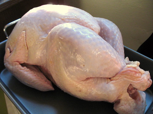 And a note on brining: my poor man’s brining meathod is to liberally, if not radically, salt the bird inside and out and let it sit for a half hour before you pop it in the oven. Also, I think poultry cooks better if its trussed with kitchen twine… ask your S&M scene friends for pointers if you’ve never done this before. (Fowl humor)