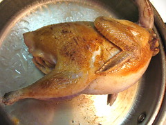 Move vegetables aside to create a clear spot for the pheasant. Place pheasant breast side-up in the center of the pan. Roast for about 20-30 minutes, or until juices run clear and internal temperature of thigh reads about 135 degrees (over-cooking will dry the lean pheasant).
