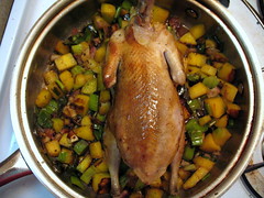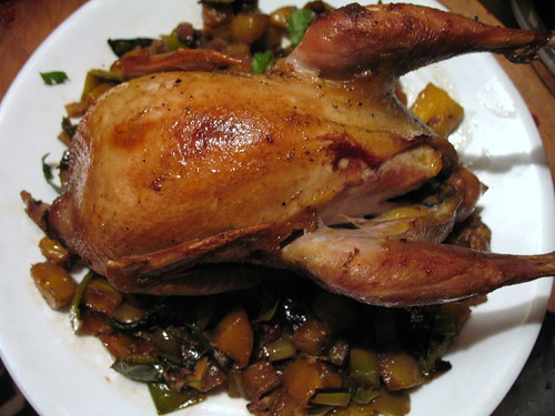 When it came out of the oven, the vegetables had soaked up the rich juices and fat from the bird, and were tender and ever so slightly burned in the most delicious way. The roast pheasant meat was truly the star of the meal, however. I served this to a room full of friends as part of a countless-course, “Fall Harvest Feast” potluck/communal cooking night. We found the pheasant easy to carve, since it was small, and so tender to boot. The perfect bite, I found, was a piece of breast meat with a strip of crackling skin on it, piled onto a fork with a stab of the vegetables. No gravy necessary, just the au jus-drenched vegetables and a twist of fresh pepper if you’re fond of that.