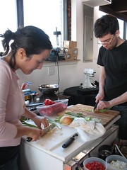 m.thew, as one of the persons in the picture above (pink sweater, thats me :)), i can tell you that it is nothing like indentured servitude. part of the whole concept of supper clubs is that it is a hands on educational experience. my knife skills improved drastically from that afternoon under the watchful eyes of michael and daniel (and cathy!), and michael sharpened my knifes. plus i got to eat a great meal, for less than the cost of a knife skills class. though, i do kind of agree with melissa that i feel a little priced out, but hopefully cathy is right about that.